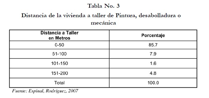Al evaluar los factores de Riesgo se evidenció que el 85.7 % de las viviendas tienen un taller de mecánica, desabolladura y/o pintura automotriz en un perímetro de 0‐50 metros, tal y como lo muestra la Tabla No. 3.