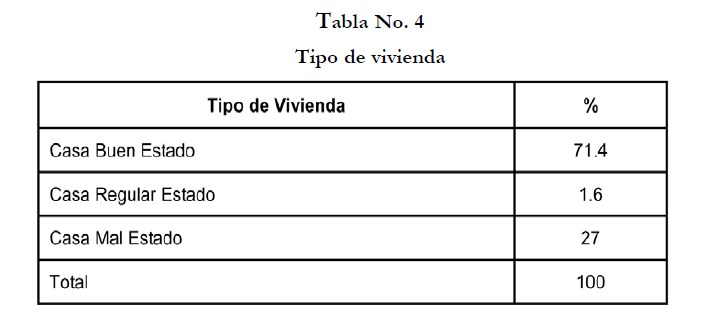 En relación al tipo de vivienda en que habitan los niños, el 71.4% (45) está en buen estado (paredes de block, piso de mosaico, pintura en buen estado, agua intradomiciliaria de la red publica), el 1.6% (1) está en regular estado (paredes de block y madera, piso de cemento y pintura en mal estado) y el 27% (17) vive en casas en mal estado (paredes de madera, piso cemento, pintura en mal estado, agua extradomiciliaria), como se evidencia en la Tabla No. 4.