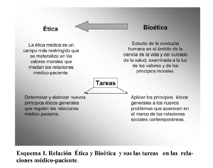 La Bioética como disciplina tiene sus antecedentes en la ética y/o deontología médica. Sin embargo, la Ética y Bioética no son una misma disciplina y suelen confundirse. La Ética médica es un campo más restringido expresado en los valores morales que median las relaciones médico‐paciente; mientras que la Bioética, toma como su objeto material la vida, campo particular de la reflexión ética en general. De aquí se deriva que su tarea no es la de determinación y elaboración de nuevos principios éticos generales, sino, la de aplicar los principios éticos generales a los nuevos problemas que se ofrecen a la consideración de la acción humana en el marco de las relaciones sociales contemporáneas. (Fons, 1996; Moya, s/f; Freyre, 2004; De Armas, 2004).