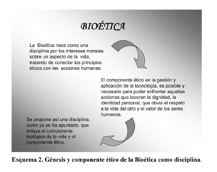 En su génesis, la Bioética nace como disciplina interesada en los principios éticos que interviene en la toma de desiciones sobre aspectos de la vida humana. Su aplicación se ha generalizado a la diversidad de diagnósticos médicos con implicaciones tecnológicas.