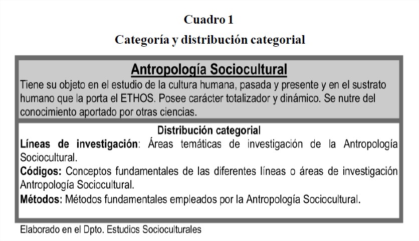 En nuestro análisis de contenido cualitativo utilizamos la categoría Antropología Sociocultural, categoría conjuntiva que integra, título, problema, objetivo, códigos y métodos)A su vez estos elementos conforman variables del análisis de contenido cualitativo al documento seleccionado (Tesis de Grado).