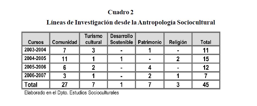 - Contamos con un grupo de tesis de grado que corresponden a investigaciones desde la Antropología Sociocultural, agrupados por líneas de investigación como son: Comunidad; Turismo Cultural; Desarrollo Sustentable; Patrimonio y Religión. De ellas un total de 45 que abordan la investigación desde la Antropología Sociocultural.