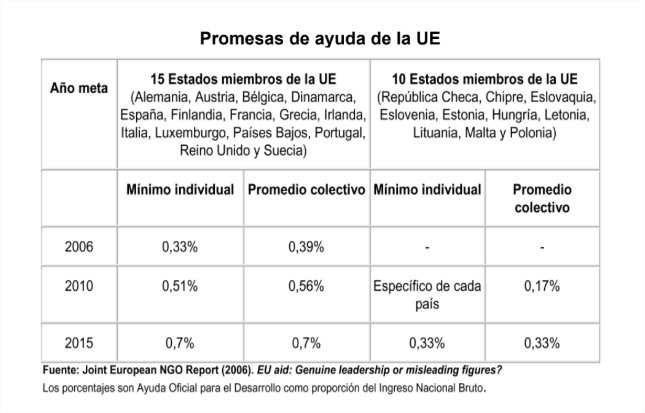 La Unión Europea (UE) ha fijado un calendario para cumplir la meta que fijara la ONU hace años para gastar el 0,7% del Producto Nacional Bruto en ayuda al desarrollo. La meta para que la UE alcance el nivel mínimo promedio de 0,56% se fijó para 2010.