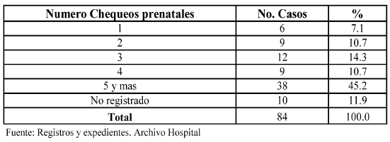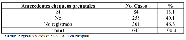 Se destaca la mala calidad del registro sobre antecedentes de chequeos prenatales, donde un 47% de los casos identificados con complicaciones no tienen registrada esta información. Del total de casos donde se registra antecedentes de chequeo prenatal en un 12% no se consigno la frecuencia. Ver tablas 6 y 7.