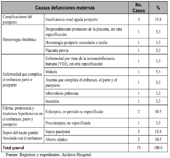 Las principales causas de las muertes maternas ocurridas durante el 2005 en el servicio fueron las sepsis del tracto genital asociada al embarazo con un 26.3%, las hemorragias obstétricas 15.8%, la insuficiencia renal aguda postparto 15.8% y la eclampsia 10.5%.