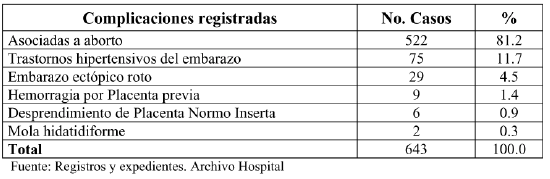 El 81 % de las complicaciones fueron consignadas como asociadas al aborto, sin especificar hemorragia, sepsis u otra condición; El 11.7% debidas a trastornos hipertensivos del embarazo, y un 7% vinculadas a hemorragia (embarazo ectópico, placenta previa y desprendimiento de placenta normalmente inserta). Este alto porcentaje de complicaciones vinculadas al aborto, probablemente guarde relación con la elevada demanda de atención por abortos en este servicio donde de cada 10 embarazadas atendidas por parto eutócico, seis embarazadas son atendidas por abortos.