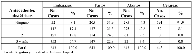 Con relación a las características obstétricas, la tabla 5 muestra que las complicaciones se presentaron en el 55% de las pacientes con tres o más embarazos previos (multiparidez), un 32 % sin partos previos, el 56% con antecedentes de aborto y solo un 8% con cesárea previa.
