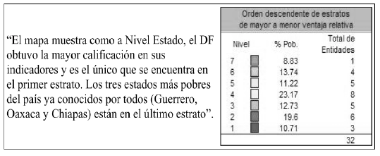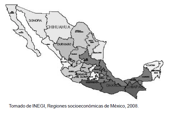 En el siguiente mapa del Instituto Nacional de Estadística, Geografía e Informática (INEGI), se muestran las regiones económicas de México; mostrando que los Estados del país que tienen mayores ventajas relativas son los de color verde y los de menor con color oscuro; los Estados con el color más sombrío son Chiapas, Oaxaca y Guerrero.