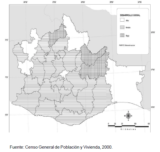 Este cambio en medida se debe a los propios pueblos indígenas que han buscado aminorar sus diferencias sociales y económicas en el espacio geográfico que habitan con respecto a otros grupos que constituyen la sociedad mexicana. La diferenciación espacial se da en diferentes niveles: municipal, estatal y nacional, veamos el siguiente mapa del Estado de Oaxaca con respeto al desarrollo social por municipios.