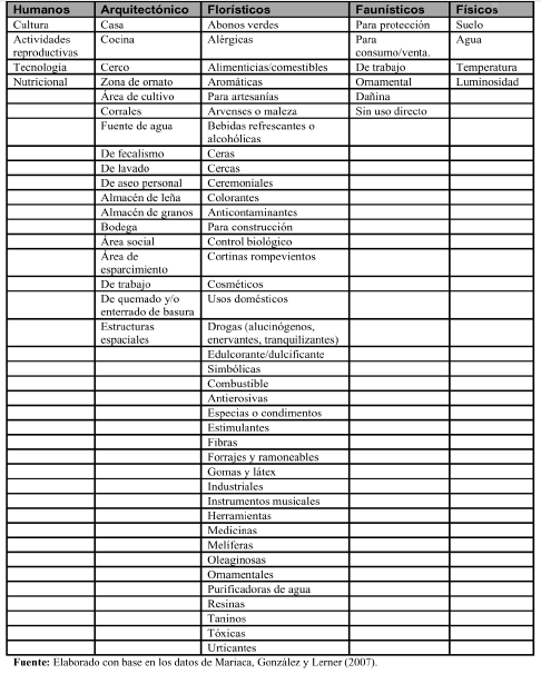 Sobre los huertos los autores identificaron siete principales componentes: 1.- árboles frutales, 2.- vegetales, 3.- plantas de ornato, 4.- aves de corral, 5.- cerdos, 6.- ganado y 7.- conejos. Una tipología como ésta permite realizar comparaciones en cuanto a su diseño en una localidad específica.