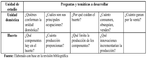 A pesar de las dificultades, es posible realizar trabajos con calidad si se emplea un cuerpo teórico y una metodología apropiada. La información socioeconómica y cultural se colecta mediante la elaboración y aplicación de un censo, con entrevistas abiertas y semicerradas, estudio de grupos focales, genealogías e historias de vida. Una serie de preguntas preliminares pueden guiarnos para conocer la situación actual de los huertos (véase Tabla 2).
