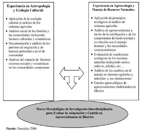 La información agroecológica se obtiene con transectos en la comunidad de estudio y la selección de un número representativo de huertos, con la elaboración de mapas participativos, inventarios de plantas y mediciones directas en los huertos. Hasta aquí se aprecian dos maneras básicas de aproximarse al estudio de huertos. La primera implica el estudio de la cultura de las personas que diseñan, cuidan y manejan el huerto. La segunda manera implica el estudio mismo del huerto, esto es, la aplicación de herramientas que permitan conocer qué es lo que se cultiva y tolera dentro de un huerto. La combinación de los aportes de la antropología y en particular de la ecología cultural junto con la agroecología se presenta en la figura 1.