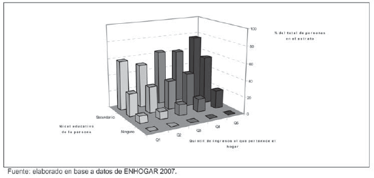 Una excepción que merece destacarse a este resultado general sobre la penetración de Internet es el caso de los hogares con jefes universitarios donde la proporción que disponen del servicio es similar en todos los estratos de ingresos, con excepción del quinto. Esto permitiría concluir que la presencia de un jefe calificado es un elemento de fuerza para que el hogar disponga de Internet a pesar de enfrentar una severa restricción presupuestaria.