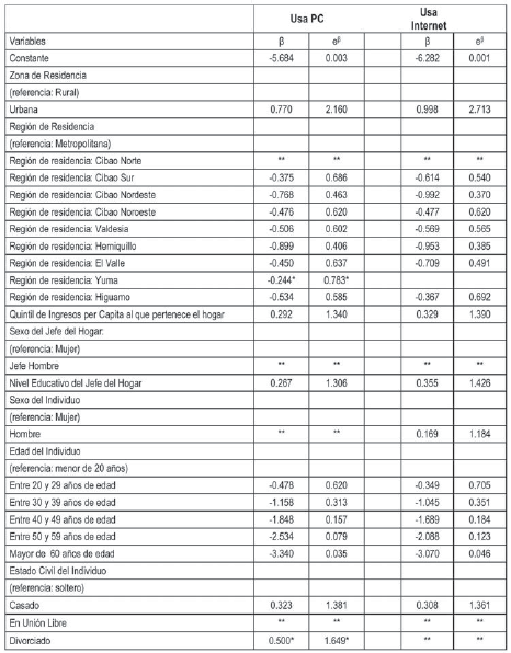 Al igual que en el análisis de los determinantes de la disponibilidad de computadoras e Internet en los hogares, también en el caso del uso de estas tecnologías la estimación de un modelo de regresión permite identificar los impactos individuales de los diferentes fenómenos sobre la decisión de utilizarlas. De tal forma en esta sección se presentan modelos de regresión logística para explicar las variables dicotómicas creadas a partir de las respuestas sobre el uso de computadoras y de Internet.