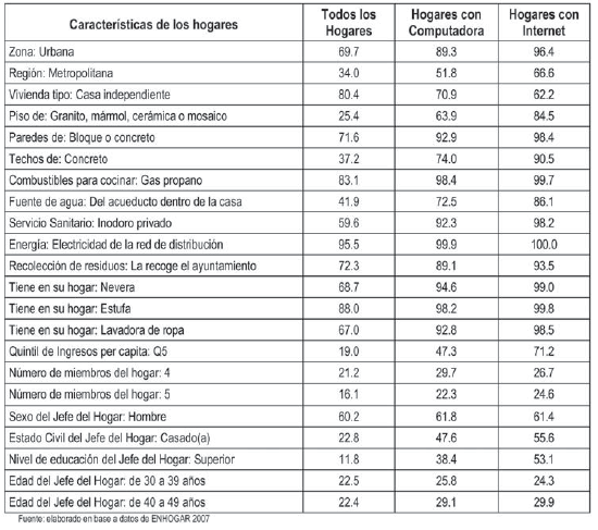 En particular, los hogares que disponen de computadoras e Internet son mayoritariamente urbanos (89% y 96% del total de los casos respectivamente), pertenecen a la Región Metropolitana (52% y 67%), habitan una casa independiente (71% y 62%), con pisos terminados (de granito, mármol, cerámica, o mosaico) (64% y 85%), paredes de bloque o concreto (93% y 98%) y techos de concreto (74% y 90%), disponen de electricidad de red (100% en ambos grupos), tuberías de agua en la vivienda (73% y 86%), sanitario (inodoro) privado en el interior de la vivienda (92% y 98%), servicio de recolección de residuos por su ayuntamiento (89% y 94%), utilizan gas para cocinar (98% y 100%), disponen de nevera (95% y 99%), estufa para cocinar (98% y 99%) y lavadora de ropa (93% y 99%). Son hogares que pertenecen mayoritariamente al quintil de más altos niveles de ingresos per capita (47% y 71%) y se componen de 4 a 5 miembros (52% en ambos grupos). En cuanto a los jefes de hogar, las características más frecuentas los describen como hombres (62% y 61%), casados (48% y 56%), universitarios (38% y 53%) y con edades entre los 30 y 49 años (55% y 54%).