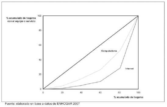 En este sentido, el Gráfico 1 muestra la concentración de la distribución de los accesos a computadoras e Internet por parte de los hogares según el nivel de ingreso utilizando la Curva de Lorenz. Como puede apreciarse de manera general, la curva de concentración de las proporciones de hogares con computadora se aleja considerablemente de la recta que representa lo que sería una distribución igualitaria (es decir en la que la proporción de hogares equipados sea la misma en cada quintil de ingresos). Este fenómeno se agudiza para el caso de la distribución de hogares con Internet. La forma en que se construye la curva permite observar, por ejemplo, que acumulando los 3 quintiles de menores ingresos, se tiene que a pesar de representar al 60% de la población de hogares, aportan menos del 10% de los suscriptores del servicio de acceso a Internet en hogares. En otras palabras, el acceso a la red se hace relevante de manera prácticamente exclusiva para los hogares del cuarto y quinto quintil.
