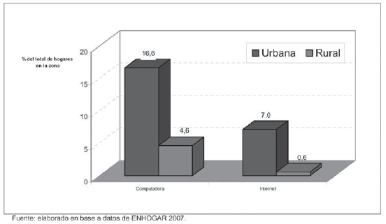 En este sentido, el mismo Gráfico 4 ofrece la información necesaria. Así por ejemplo, en el caso de los hogares urbanos, combinando el hecho de que la presencia de computadoras alcanza al 16.6% y de Internet al 7.0% se tiene que, entre los hogares que disponen de computadoras, los que además cuentan con acceso a Internet en el hogar representan el 42.2%. Por su parte, en el caso de los hogares rurales con computadora, los que disponen también de Internet suman el 13%. La comparación de estas proporciones permite evidenciar que, luego de aislar el hecho de que entre los hogares rurales la presencia de computadoras es menor que entre los urbanos, considerando solamente a los hogares con computadoras, también se registra que la presencia de Internet entre ellos es menor en las zonas rurales.