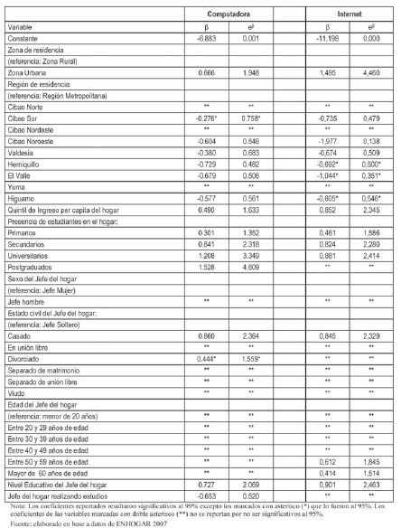 Más allá de la validez de los resultados comentados hasta aquí, debe matizarse que la metodología permite apenas un primer acercamiento al análisis de los componentes de la brecha digital. Esto es así, tanto porque existe una multitud de factores y variables que considerar además de la zona de residencia, el ingreso y la educación del jefe del hogar (factores como la edad, sexo y estado civil de los jefes de hogar, por ejemplo), como porque es necesario establecer el efecto marginal de cada uno de esos elementos sobre la disponibilidad de los bienes o servicios, algo que no puede hacerse con precisión con los elementos empleados. En esta dirección se avanza en la siguiente sección.