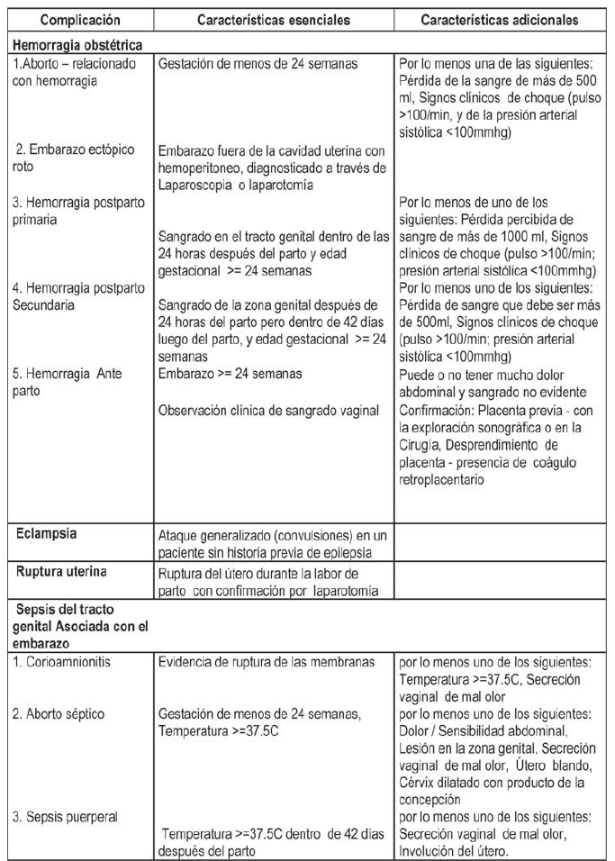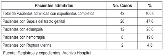 Entre enero 2005 y diciembre 2007 se detectaron con expedientes completos unos 42 casos de defunciones por complicaciones obstétricas. La mayoría de estos (47%) fueron casos de sepsis en el tracto genital, seguido por eclampsias (28%) y la hemorragia (19%). Ver tabla 1.