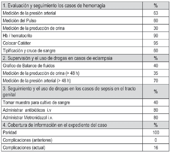Se calcularon proporciones de las complicaciones más frecuentes observadas y tasas de mortalidad materna según estas complicaciones. Se estableció frecuencia y porcentajes de las prácticas y conocimientos según los criterios de buena práctica establecidos.