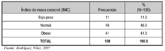 Una vez establecido el IMC de los estudiantes se obtuvo que un 48% de los estudiantes poseen un peso adecuado; un 41% son obesos y el 11% tienen bajo peso, como lo evidencia la Tabla No. 3.