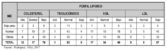 De acuerdo al índice de masa corporal y el perfil de lípidos se observa que de los 13 estudiantes con colesterol alto, 4 de ellos eran obesos; la estudiante que tenía triglicéridos elevados tenía un IMC normal. De los 17 con HDL elevada, 11 de ellos tenían un IMC normal y de los 5 con LDL alta, 3 de éstos también se hallaron con IMC normal, tal como se evidencia en la Tabla No. 6