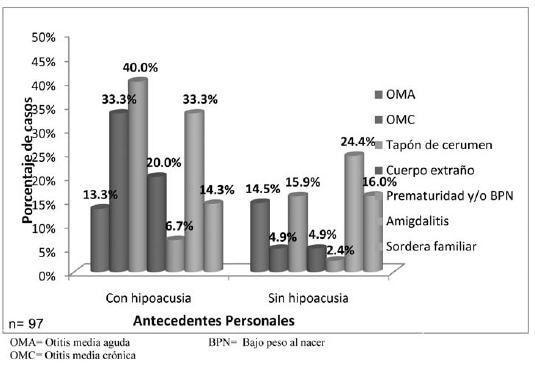 Estudios previos demuestran que la prevalencia de hipoacusia aumenta con la acumulación de pérdidas auditivas adquiridas y por hipoacusias hereditarias de manifestación tardía(3), por lo que se hace necesario conocer cuáles son los antecedentes patológicos de cada niño evaluado para así detectar si tiene factores predisponentes de hipoacusia. Dentro de los antecedentes más frecuentes y con mayor poder predictivo en el grupo con hipoacusia estuvieron el tapón de cerumen y la otitis media crónica. Esto se asocia a que la OMC se acompaña generalmente de hipoacusia variable en función de las lesiones del tímpano y de la cadena osicular(17).