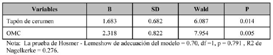Para explorar las causas más influyentes en la presencia de hipoacusia, realizamos una regresión logística paso a paso donde incluimos como variables las siguientes antecedentes y hallazgos: haber tenido otitis media aguda, otitis media crónica, algún cuerpo extraño, tapón de cerumen, haber sufrido algún trauma de oído, bajo peso al nacer, haber tenido amigdalitis, infección respiratoria aguda a repetición (IRA) e historia de sordera familiar. Tan sólo dos de estas variables resultaron significativas en la predicción de la hipoacusia. Estas fueron: tener o haber tenido tapón de cerumen y haber padecido de otitis media crónica. (Tabla 1). Sin embargo el bajo ajuste del modelo total para la predicción de la hipoacusia, indica que posiblemente otras causas y hallazgos no contemplados en este estudio, sean más determinantes.