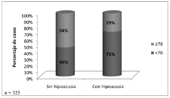 El rendimiento escolar de cada estudiante fue determinado mediante el promedio de las calificaciones obtenidas en todas las asignaturas del último semestre cursado. Para evitar sesgos causados por estudiantes repitentes, sólo se seleccionaron aquellos que cursaban su nivel escolar por primera vez. El rendimiento escolar promedio así calculado fue de 76.79 puntos (n = 289, rango 10 a 98, DE = 11.05). Al comparar el rendimiento escolar de los estudiantes con hipoacusia con el resto de los alumnos, encontramos una proporción significativamente mayor de hipoacúsicos con notas inferiores al rendimiento escolar promedio (Chi2 = 6.71, gl = 1, p = 0.012, ver Gráfica 2).