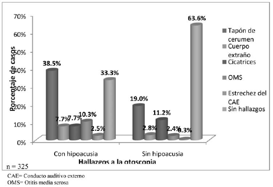 En el grupo de estudiantes con hipoacusia encontramos una mayor proporción de hallazgos a la otoscopía que en el grupo sin ésta, confirmando los resultados de otros estudios similares a éste que indican que la mayor parte de las hipoacusias en niños son conductivas, causadas por alteraciones en oído externo y oído medio que impiden la transmisión del estímulo sonoro al oído interno.(8, 15, 16, 17)