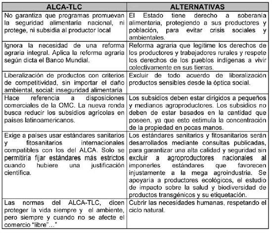 - Las transnacionales americanas y sus diversas variantes de «desarrollo nacional» (alca, tlc, ppp, cbm) impactan negativamente en la agricultura y áreas rurales.