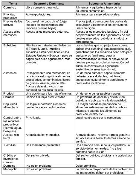 Pero, la soberanía alimentaría va más allá del concepto de seguridad alimentaría, lo cual ha sido despojado de su verdadero significado por las diversas maneras en que el concepto ha sido manipulado por diferentes intereses creados. Si bien, la seguridad alimentaría significa que cada niño, cada mujer y cada hombre deben tener la certeza de contar con el alimento suficiente cada día. Pero el concepto no dice nada con respecto a la procedencia del alimento o la forma en que se produce. De ese modo, las transnacionales argumentan que la importación de alimentos baratos desde los Estados Unidos es una excelente manera que tienen los países pobres de lograr seguridad alimentaría, más que si la producen ellos mismos (Antle,1998). Pero la importación masiva de alimentos subsidiados abaratados socava a los agricultores locales, obligándolos a abandonar sus tierras y condenándolos a la miseria. Ellos engrosan las cifras de los hambrientos, ya que su seguridad alimentaría se pone en manos del mercado, cuando migran a los barrios urbanos pobres, en donde no pueden hallar un empleo asalariado que les permita vivir bien. Para lograr una seguridad alimentaría real, los pueblos de las áreas rurales deben tener acceso a tierra productiva, y a recibir precios justos por sus cosechas que les permita gozar de una vida digna.
