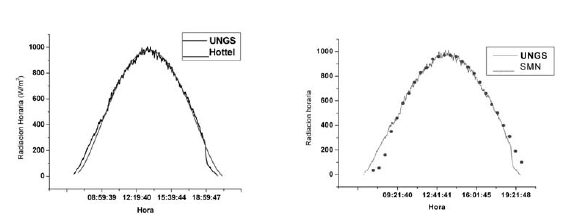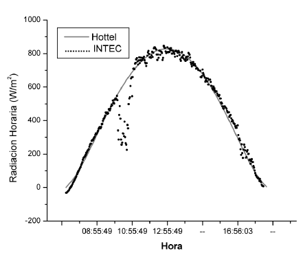 Se puede observar en la gráfica que los datos de radiación medidos en el INTEC resultan bien ajustados si se los compara con la curva teórica. El error porcentual sin tener en cuenta las zonas con aparición de nubosidad, ya que el modelo de Hottel es solo aplicable para días claros, es del 7,7 %.
