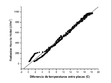 La primera calibración se realizó en la Universidad Nacional de General Sarmiento (Bs. As). Para eso se midieron las temperaturas de ambos extremos de la barra durante las horas de sol para un día claro, y se graficó la radiación horaria calculada con el método de Hottel3 en función de dicha diferencia de temperaturas, obteniéndose una recta.