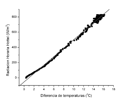 Por otro lado se realizó otra calibración utilizando los datos del Servicio Meteorológico Nacional argentino, que nos permitió validar la curva teórica de Hottel.