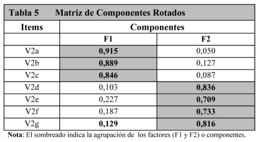 Así, y de acuerdo a los resultados presentados en la tabla 5, en un factor (F1) quedan agrupados los ítems: V2a, V2b y V2c. Y en el segundo factor (F2), los ítems: V2d, V2e, V2f y V2g, tal como fue sugerido en esta investigación.