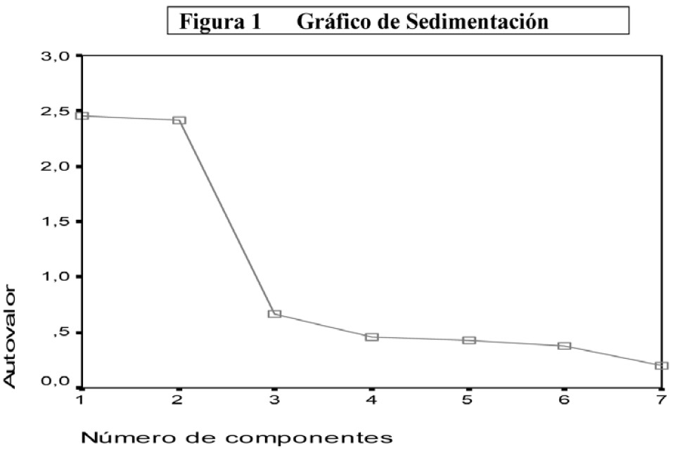 Para confirmar los resultados anteriores, se acompañó al Análisis Factorial con el gráfico de sedimentación –ver figura 1–. En el mismo, se observa que los dos primeros componentes tienen auto-valores mayores a uno y se alejan de manera importante de cero, viéndose una clara inflexión a partir del tercero, lo que permite afirmar la pertinencia de extraer sólo dos componentes principales. Los restantes, se consideran residuales y carentes de sentido para el análisis.