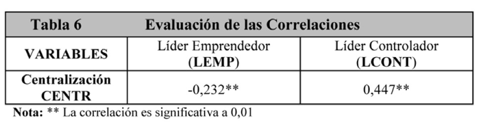 Para contrastar las hipótesis propuestas en el marco teórico, se aplicó la prueba estadísticas análisis de correlaciones entre las variables centralización y estilo de líder en sus dos dimensiones: emprendedor y controlador. Los resultados de esta prueba se ofrecen en la tabla 6.