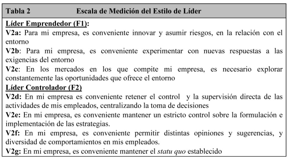 Se llevó a cabo un análisis factorial exploratorio para verificar la existencia de dos factores que explican el constructo estilo de líder –controlador y emprendedor–, tal como se planteó en el marco teórico, utilizando para el tratamiento de los datos el paquete estadístico SPSS 16.0®.
