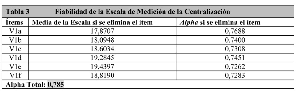 Se observa en la tabla 3, que el Alpha total supera el valor mínimo de 0,700 sugerido por Hair (1999), por tanto queda razonablemente demostrada la fiabilidad de la escala que cuantifica el constructo centralización.