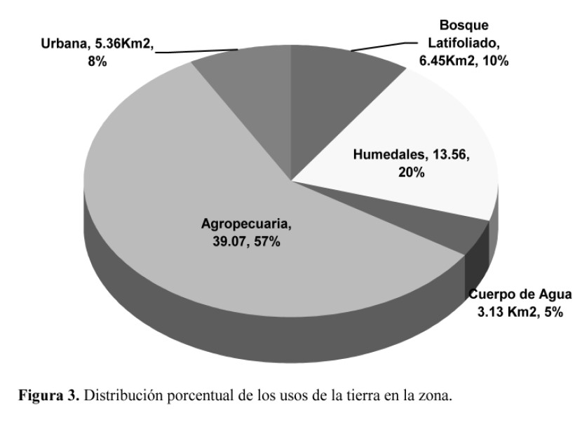 En el mapa de uso de la tierra realizado (Fig. 4) se puede observar que las principales zonas donde existen humedales se encuentran sobre todo en la parte sur del Parque, especialmente en los terrenos ubicados entre el Río Ozama y Arroyo Tosa. Sin embargo, es justamente en el límite sur del Parque donde la zona urbana se encuentra mayormente, en algunos puntos de manera contigua con los humedales, posiblemente ocupando parte de su distribución original. Prácticamente toda la zona norte, con excepción de una zona de humedales que bordea el Arroyo Ahoga Vaca, es eminentemente agropecuaria.