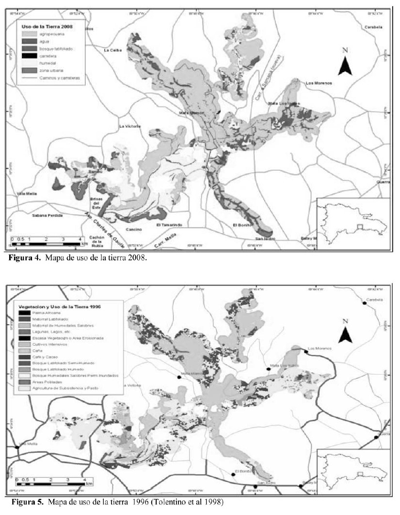 Para caracterizar el uso de la tierra reciente en la zona de estudio se utilizaron dos fuentes de datos: 1) Nueve fotografías aéreas digitales de alta resolución, a color natural (escala 1:10,000). Dichas imágenes fueron adquiridas en formato digital en el Instituto Nacional de Recursos Hidráulicos (INDRHI). Estas imágenes cuentan con una resolución de 0.5 metros y datan de 2002. Dichas imágenes (adquiridas en formato TIFF) fueron georeferenciadas utilizando el programa ERDAS Imagine (versión 9.0) utilizando como referencia la hoja topográfica digital de la zona (hoja Villa Mella, no 6271IV Edición 4 ICM/DMA). 2) Imágenes satelitales de alta resolución obtenidas a través de capturas de pantalla del visualizador en línea de Google Earth© con imágenes correspondientes a 2007. Estas imágenes en pantalla se pueden visualizar hasta 0.5 m de resolución. Estas imágenes fueron georeferenciadas utilizando la cuadrícula de latitud/longitud que superpone esta aplicación sobre las mismas utilizando el programa ERDAS Imagine también. Es decir, que para cada imagen se hicieron dos capturas de pantalla: una con la cuadrícula y otra sin la cuadrícula. La imagen de la cuadrícula fue fácilmente georeferenciada utilizando la el módulo de corrección geométrica de ERDAS Imagine y manualmente digitando los valores de tres coordenadas correspondientes a intersecciones de la cuadrícula. A su vez, esta imagen sirvió para georeferenciar la imagen gemela sin cuadrícula, empleando puntos comunes visibles en ambas, con el mismo módulo. Una vez todas las imágenes fueron georeferenciadas, se cargaron en mapa en pantalla utilizando ArcMap y se procedió a digitalizar en pantalla (heads up digitizing) los polígonos correspondientes a los distintos usos que se verificaban en las imágenes en un archivo shapefile de polígonos. Para fines de orientación en el mapa (y planificación de campo) se sobrepusieron a las imágenes los archivos shapefiles de carreteras, poblados y ríos del país creadospor el proyecto Sistema de Información Geográfica para el Área de Salud (SIGpAS 2003).