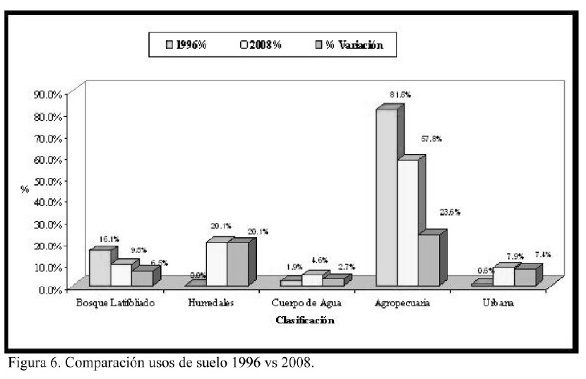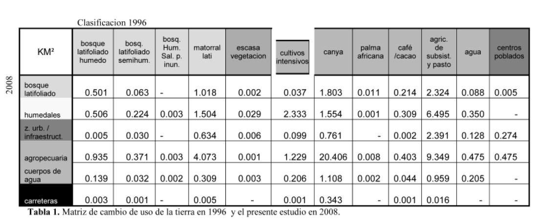 Sin embargo, se pudo detectar un cambio de algunas zonas previamente agrícolas (mayormente Agricultura de Subsistencia/ Pastos así como Caña) hacia Bosque Latifoliado en 2008 que pudiera explicarse por el abandono de tierras dedicadas anteriormente al cultivo de la caña de azúcar y otros rubros (Volmar 2008), dando lugar a la regeneración de la vegetación del área. También puede verse en la Tabla 1 que el aumento del crecimiento urbano (en un 7%) ha sido mayormente a expensas de zonas previamente agropecuarias.