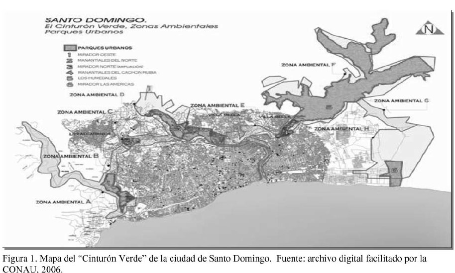 El Cinturón Verde de Santo Domingo es una amplia franja de terreno que rodea al Distrito Nacional y a los tres municipios de la Provincia Santo Domingo: Santo Domingo Este, Santo Domingo Norte y Santo Domingo Oeste ( Figura 1). Originalmente, el Cinturón Verde fue concebido como el componente ambiental del “Plan Maestro de la Ciudad de Santo Domingo” o “Plan Director Urbano” (CONAU, 2008). De este trabajo resultaron una serie de planos y mapas que permitieron que las autoridades notaran la importancia de esta zona y le dieran una atención especial, creando oficialmente esta zona mediante el decreto número 183-93, del año 1993.