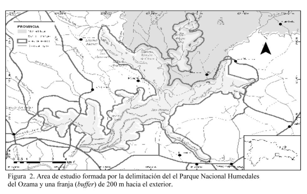 Primeramente, para delimitar el área de estudio se extrajo del mapa digital más reciente de las áreas protegidas de la República Dominicana (formato ESRI shapefile) obtenido de la Secretaría de Estado de Medio Ambiente y Recursos Naturales (SEMARENA) la delimitación del Parque Nacional Humedales del Ozama. Dicha delimitación corresponde a Ley Sectorial de Áreas Protegidas, promulgada en 2004 (Ley 202-04). A partir de este archivo, utilizando la herramienta de creación de zona de influencia (buffer) de ArcMap, se creó un nuevo polígono que representara la zona del Parque junto a una zona de influencia de 200m. Esto así para poder detectar no sólo los usos actuales y su dinámica dentro del Parque sino también los usos en su periferia inmediata. Esto arrojó un área de trabajo total de 72.4 km2.