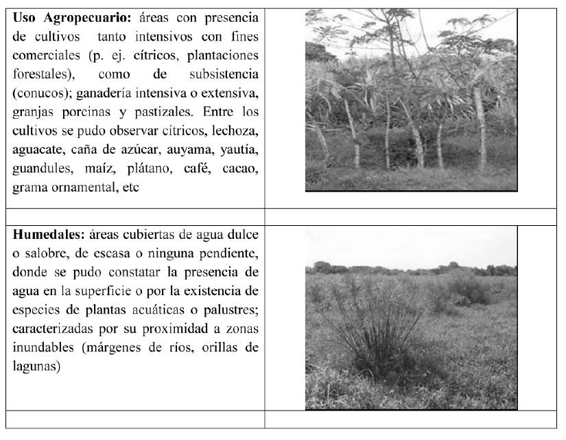 Tras analizar las imágenes obtenidas y realizar visitas de campo es posible, a modo general, hacer la siguiente descripción de cada uno de los usos observados, que sirve para una caracterización de base de usos de la tierra para la zona de los Humedales del Ozama.