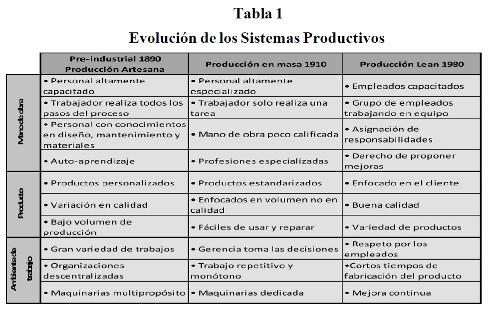 Para comenzar a analizar los sistemas productivos es necesario ir hacia los orígenes de la industria del automóvil en el siglo xix. Al pasar de los años estos han ido evolucionando, sin embargo se podrían distinguir tres grandes sistemas o modelos de producción con características muy marcadas con relación a los métodos de producción, roles de los trabajadores, tipos de productos a elaborar, forma de crear el valor en el producto y objetivos de la empresa. Los cuales son: el sistema de Producción Artesana, Producción en Masa y Producción Ajustada o Lean Manufacturing.