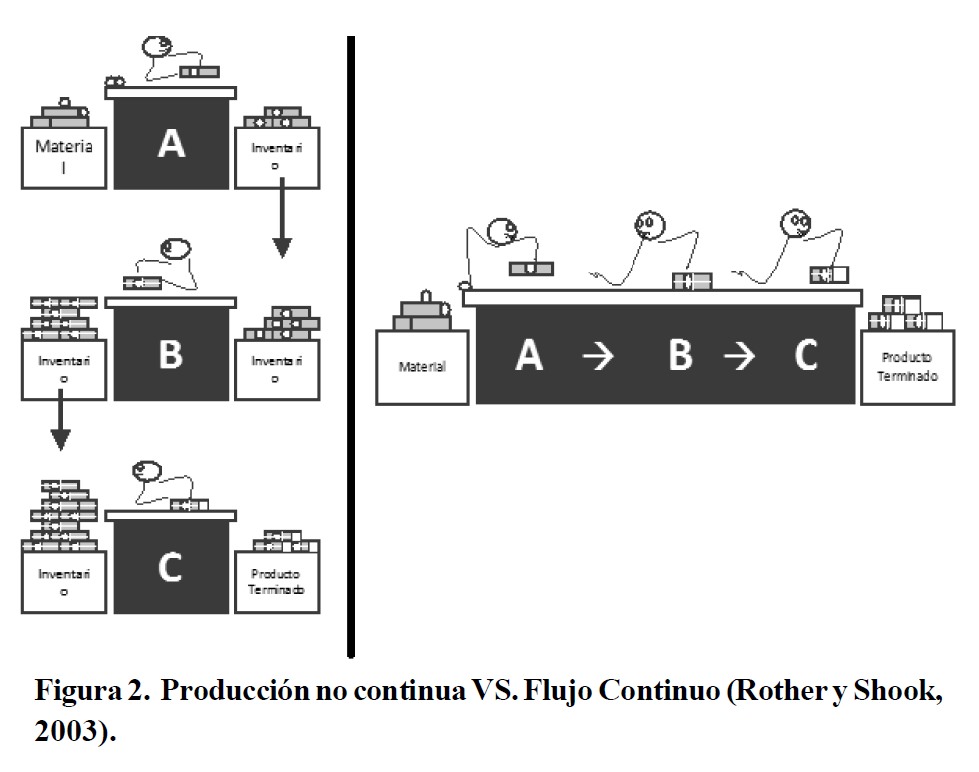 Hacer que el producto fluya sin interrupciones: El material debe fluir a lo largo del proceso de producción al ritmo del takt time9 de forma continua de pequeñas cantidades de producción hasta lograr fabricar y mover una pieza a la vez sin interrupciones y sin vuelta atrás, como se muestra en las figuras 2.
