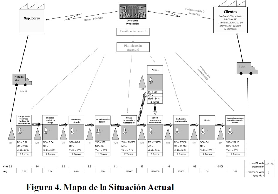 En el mapa del estado actual el dato que más llama la atención es el tiempo de maduración o lead time, el cual es de 440 días, cuando realmente el tiempo en valor agregado es de 31 días. Esto es debido al gran volumen de inventario existente en la planta de productos en proceso y por consecuencia, la materia debe durar largos períodos de tiempo en la bodega antes de ser despachado.