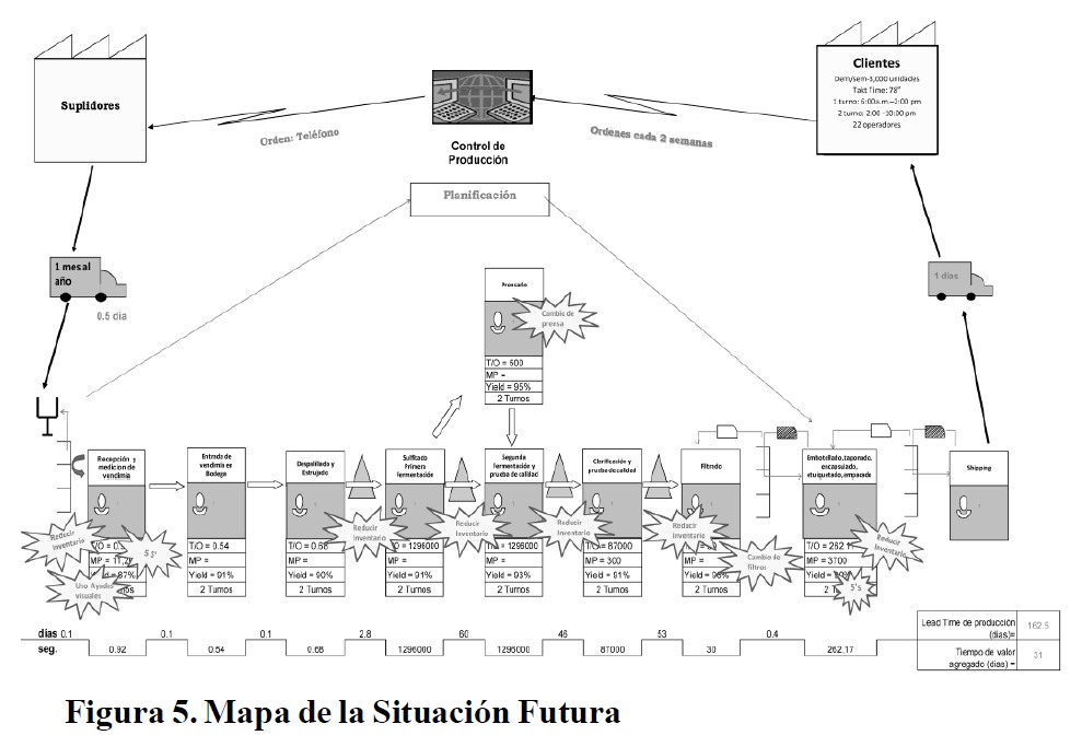 El mapa de estado futuro es mostrado en la figura 5, donde se agregan las mejoras propuestas y se señalan las áreas potenciales de mejora con las figuras estrelladas. Con esas mejoras, el tiempo total de espera de producción es de 162 días. Lo que quiere decir que el tiempo de valor agregado ahora es un 19% del total de tiempo de espera de producción, cuando antes era sólo un 7% en el mapa de estado actual. Tenemos menos inventario en proceso y se reduce la sobreproducción.